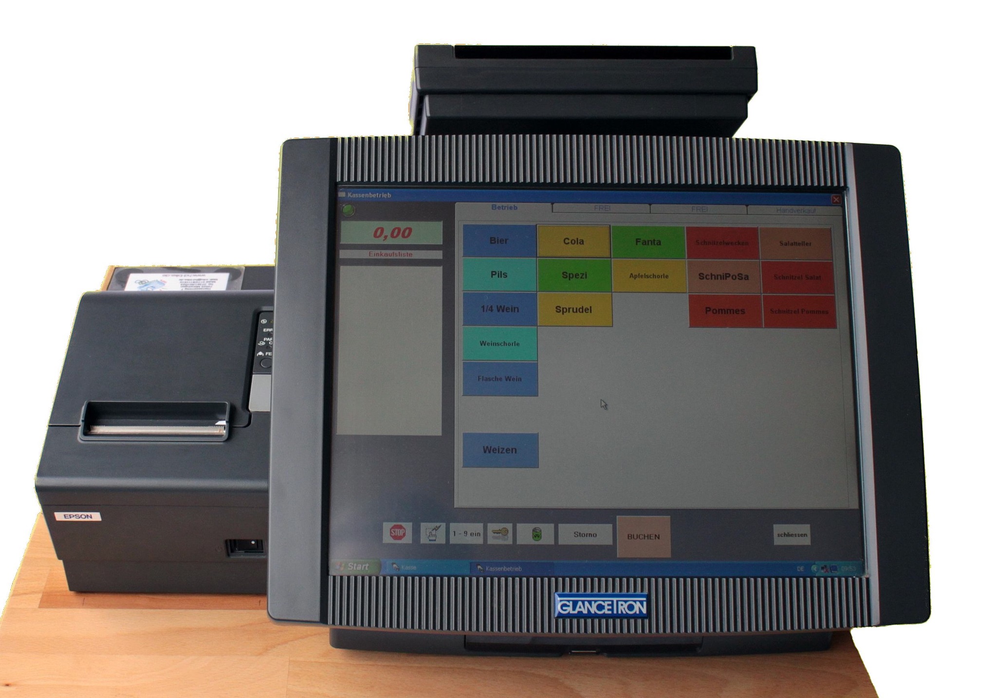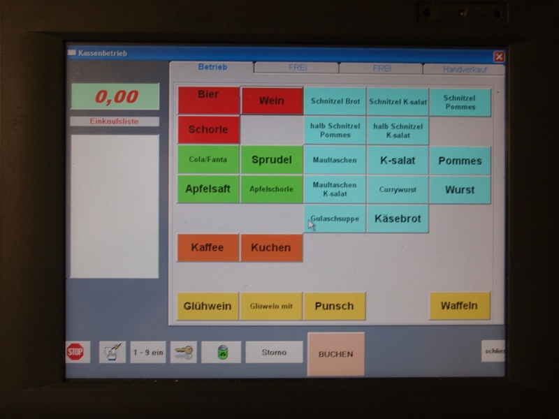 Die einzelnen Artikel sind als Schaltfläche auf dem Monitor angeordnet und müssen lediglich angewählt werden. Eine Einkaufsliste gibt den nötigen Überblick. Korrekturen sind jederzeit möglich. Ein Klick auf bezahlen schließt die Eingabe ab.